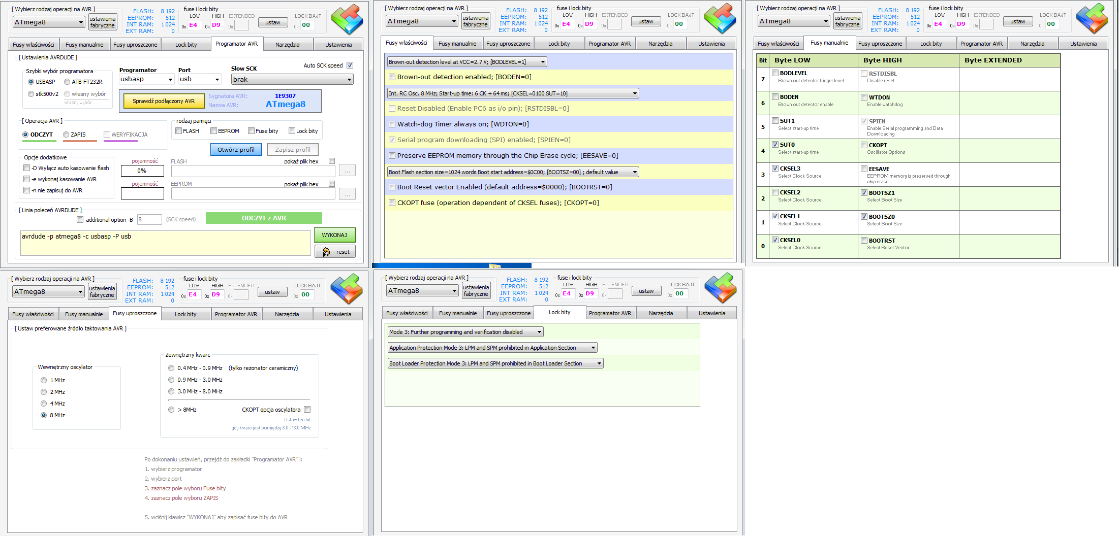 Natomiast w zupełnie innym układzie mam ATmegę8, której fuse bitów i lock bitów nie mogę zmienić za pośrednictwem USBasp mimo, że programator widzi procesor.